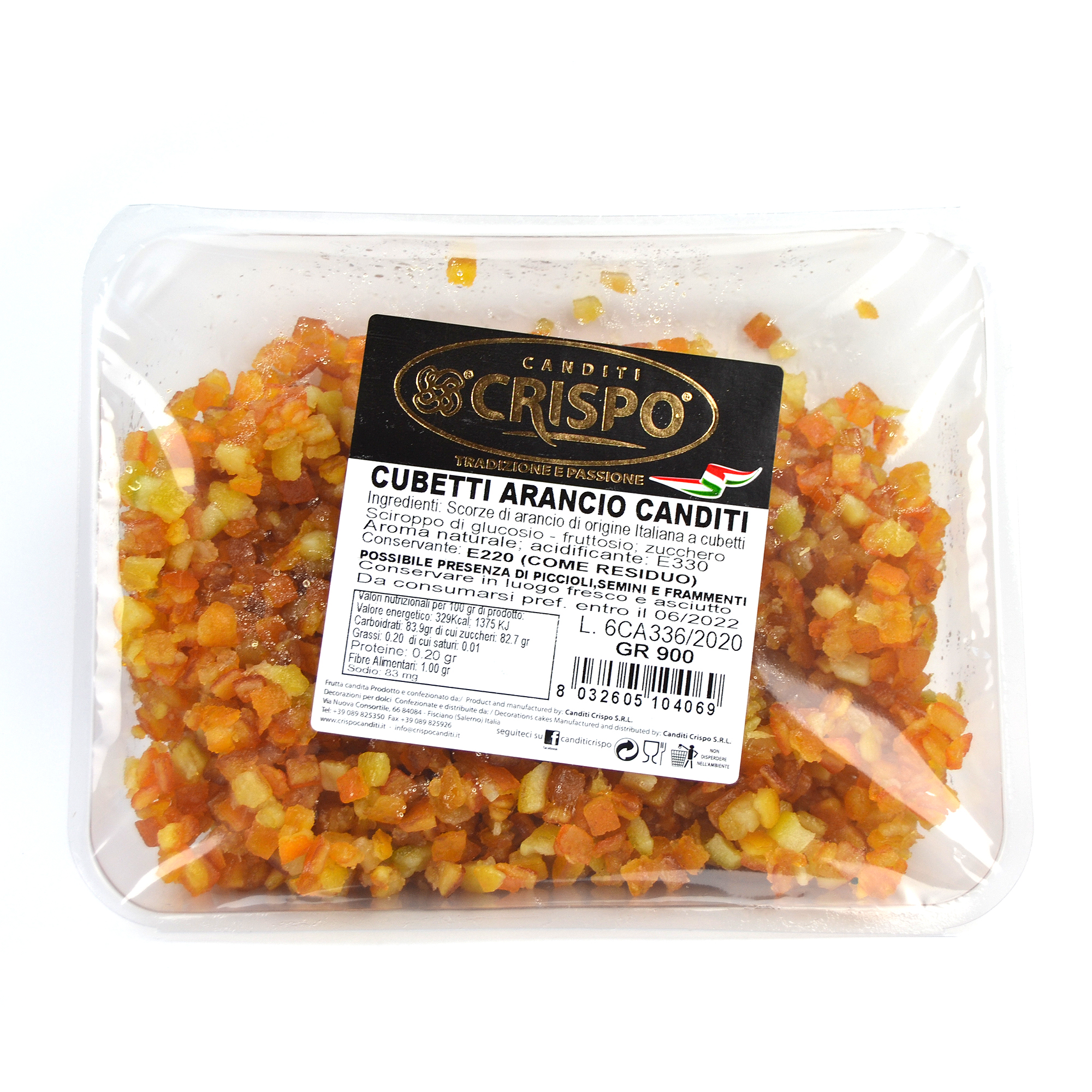 | Imballo: VASCHETTA DA 900 GR | | Confezione: GR 900 CUBETTI DI ARANCIO CANDITI PER DOLCI, PANETTONI, CASSATE |